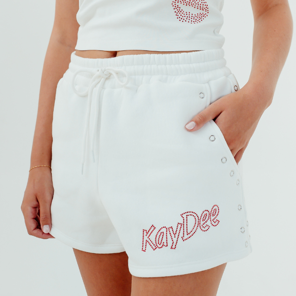 Bold, flirty, and full of attitude the Kisses Set is made to turn heads. The high neck rib tank features a sleek silhouette in 100% cotton 1x1 rib, detailed with metal grommets for an edgy twist. Paired with matching fleece grommet shorts made from a soft cotton-poly blend (280 GSM), this set blends streetwear with comfort. Finished with vendor-sourced drawstrings, elastic, and sparkling rhinestone Kisses accents, it's your go-to for elevated casual wear with a glam edge.